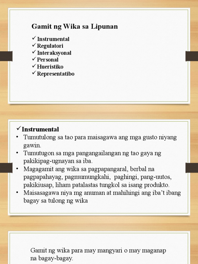 Sa wikang instrumental nagbibigay ng tugon pakiusap at pag-uutos ang isang tao ngunit maaaring ito para lamang sa kaniyang sariling pangangailangan. 6252016 Ang Regulatori ay wikang gumagamit ng kondesyones. Tiyak na Sitwasyon sa Regulatori Pag-uutos ng magulang sa anak.