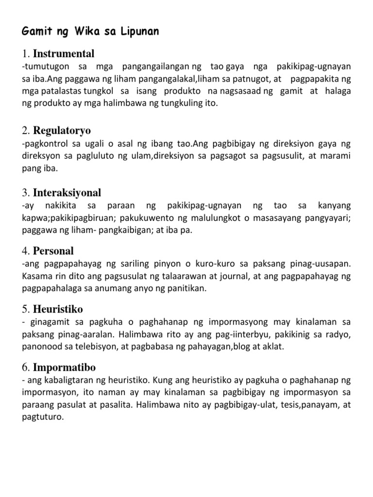 Expressive na gamit ng Wika Basahin ang sumusunod na liriko mula sa piling. 10292020 Anomang wika ay may tungkuling tumugon sa pangangailangan ng tao at lipunang kinabibilangan nito. 7162016 Instrumental Regulatori Interaksyunal Personal Hueristiko Impormatibo Gamit ng Wika Imahinatibo 16.