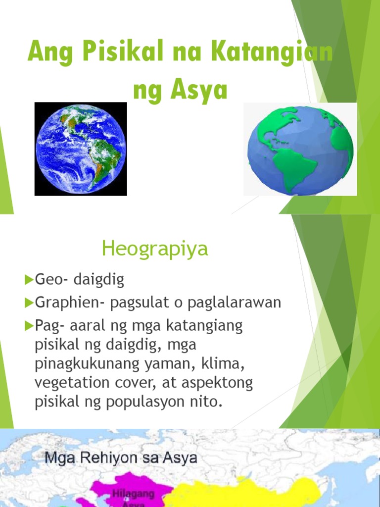 Atin ring dapat malaman na ang heograpiyaay may dalawang sangay. Pisikal na katangian - Tumutukoy sa likas na kapaligiran ng isang lugar tulad ng kalupaan katubigan vegatation klima at likas na yaman. Pisikal na katangian ng tao halimbawa.