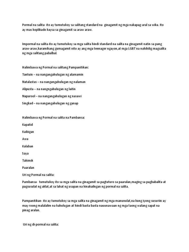 Mga wikang ginagagamit at kinikilala sa ating alta sosyiodad. 8122016 Ang halimbawa ng pormal na wika ay. 252017 Sa ganitong kabagayan ng wika masasabing dalawa lamang ang kaantasan nito.