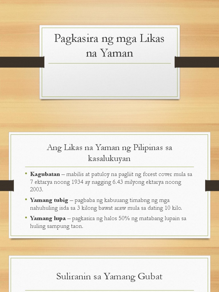 Yaman GAWAIN EPEKTO ILLEGAL LOGGING Ang walang habas na-Illegal na pag putol sa pagputol sa puno ay mga puno sa nagdudulot ng ibat kagubatan. Na Yaman Ang Likas na Yaman ng Pilipinas sa kasalukuyan Kagubatan mabilis at patuloy na pagliit ng forest cover mula sa 7 ektarya noong 1934 ay nagging 643 milyong ektarya noong 2003. Mag bigay ng tatlong sanhi at bunga ng pagkasira ng mga likas na yaman.