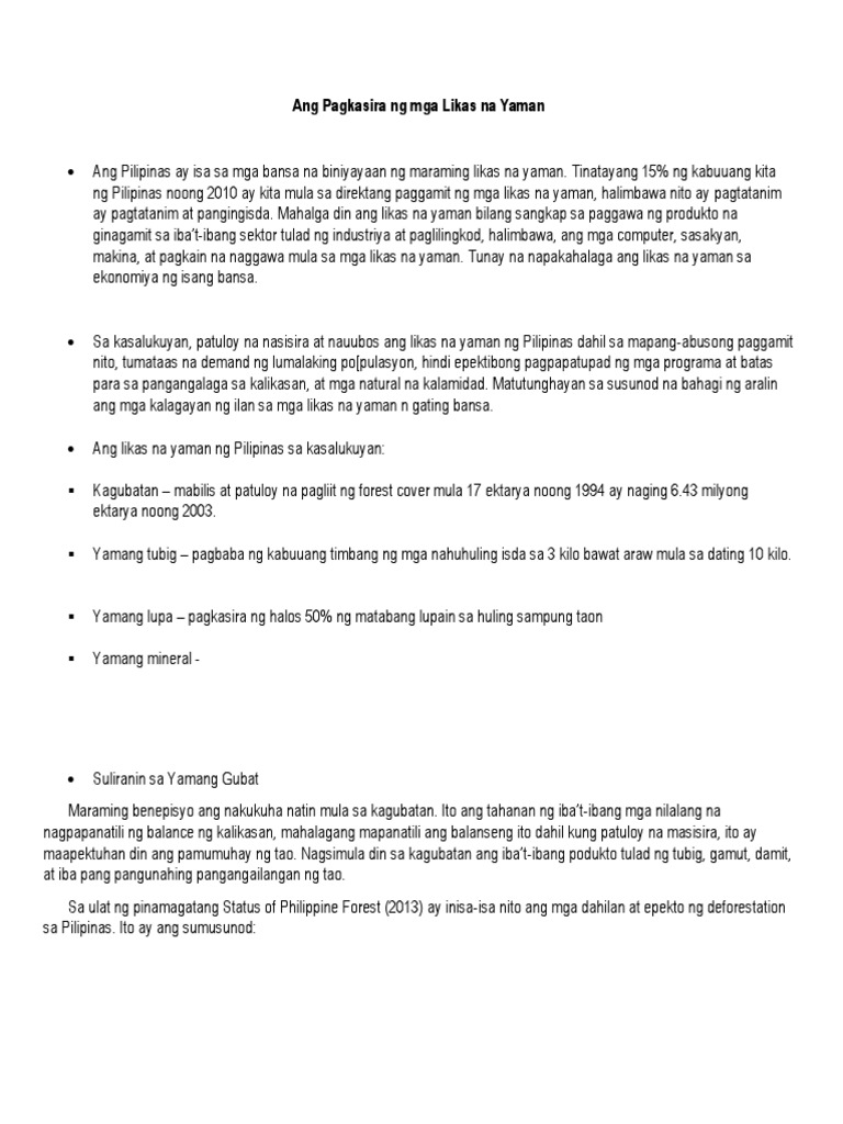 Isa sa mga bansang sagana sa likas na yaman ay ang Pilipinas. 2 on a question. 1 question Ano ang mga sanhi at bunga ng pagkasira ng likas na yaman.